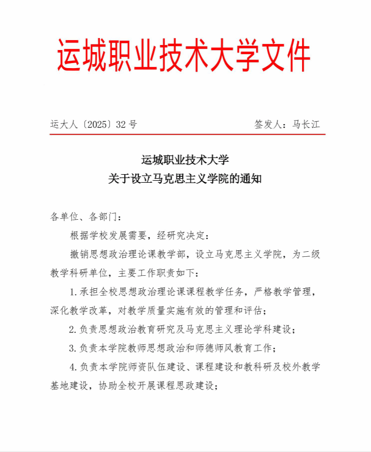 撤销思想政治理论课教学部,设立马克思主义学院,为二级教学科研单位,主要工作职责如下: